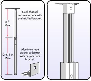 Tubes are mounted into a sleeve cup on the slab and attached to the steel joists at the top. This allows for the grille/closure to be installed first before any walls are built eliminating the difficulty of working around studs, HVAC and plumbing.